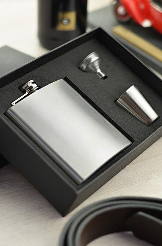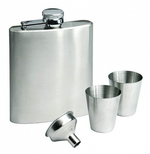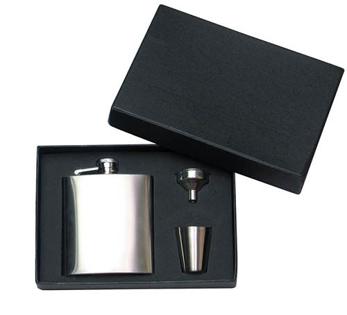 Zestaw: piersiówka o pojemności 180 ml, dwa kieliszki oraz lejek. Elementy wykonane ze stali nierdzewnej, pakowane w czarny kartonik.